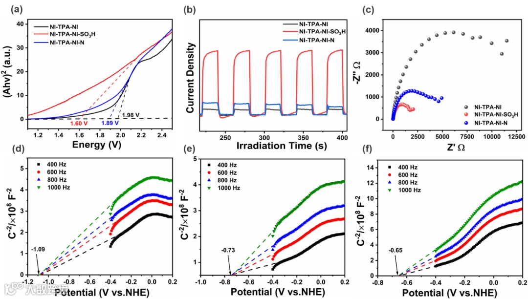 图2. a) Tauc图,b)光电流,c) 电化学阻抗;莫特-肖特基曲线:d) NI-TPA-NI,e) NI-TPA-NI-SO3H和 f) NI-TPA-NI-N。