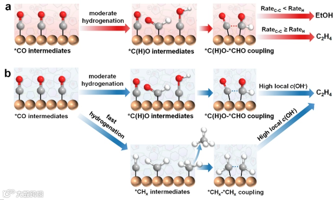 此外,CO2RR反应路径可以通过PIL层调控。Cu@PIL@Cu倾向于通过*C(H)O-*CHO耦合模式生成EtOH和C2H4(图6a)。Cu@BPIL@Cu则由于更强的加氢活性和限域作用,转变了CO2RR反应路径(图6b)。