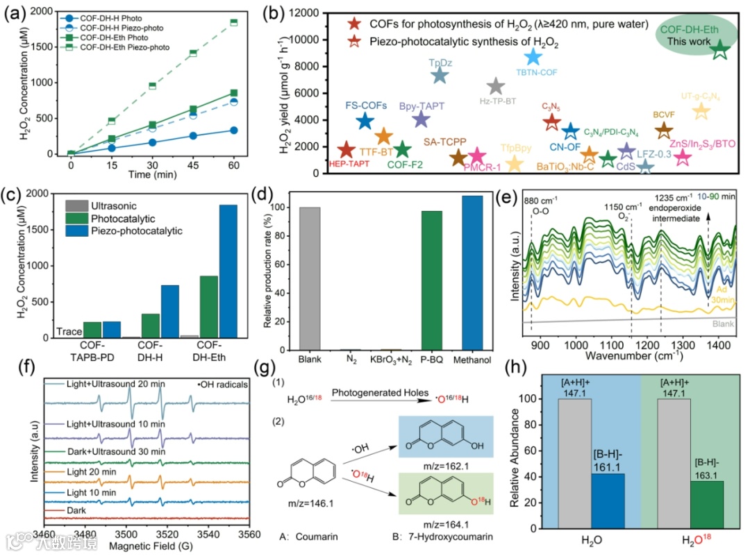 图3.(a)COF-DH-H和COF-DH-Eth的光催化和压电光催化活性对比;(b)COF-DH-Eth与最近报道的光催化材料和压电光催化材料合成H2O2的性能对比;(c)COF-TAPB-PD、COF-DH-H和COF-DH-Eth在超声波、光催化和压电光催化处理一小时后产生的H2O2的浓度;(d)COF-DH-Eth在不同条件下压电光催化一小时内产生H2O2的相对量:对照组、10%甲醇、对苯醌(0.1 mM)和KBrO3(0.1 mM);(e)COF-DH-Eth的原位DRIFTs光谱与光照时间的关系(灰线和黄线分别代表基线和用蒸汽/氧气处理30分钟的平衡系统);(f)在不同条件下检测COF-DH-Eth中形成的•OH-DMPO 复合物的EPR光谱;(g)香豆素荧光方法与H218O同位素标记实验相结合的示意图;(h)以H2O和H218O为底物时香豆素与羟基自由基反应的质谱分析。