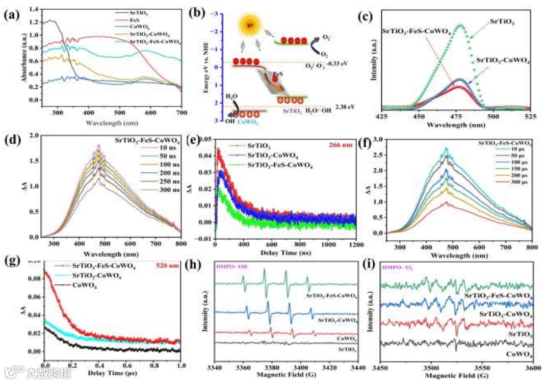 图2. 光学表征。(a) UV-vis DRS图谱;(b) SrTiO3-FeS-CoWO4 Z型异质结的能带图;(c) SrTiO3、SrTiO3-CoWO4和SrTiO3-FeS-CoWO4的稳态PL光谱;(d-e) 在纳秒时间尺度记录SrTiO3-FeS-CoWO4的TA 光谱和266 nm处相应的TA 动力学轨迹;(f-g) 在微秒时间尺度记录SrTiO3-FeS-CoWO4 的TA 光谱和520 nm处相应的TA 动力学轨迹;(h)·OH 和(i)·O2-自由基的 EPR 谱图。