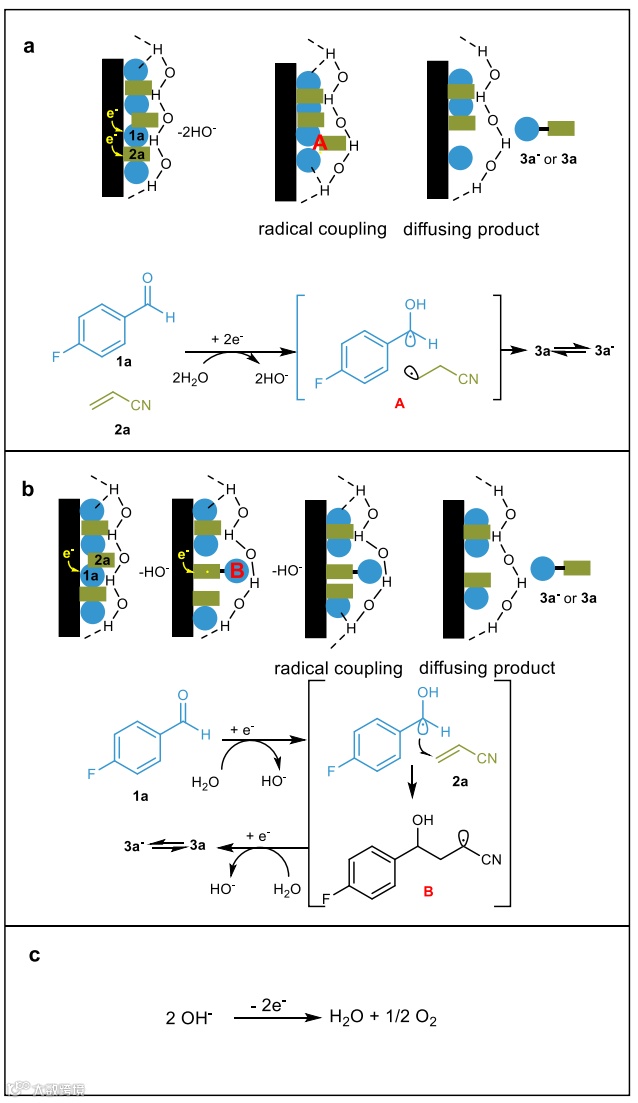 因此提出可能的机理:在阴极处发生双电子还原途径(图4a),或者一个电子还原路径在阴极发生两次(图4b)。阳极则发生析氧反应,氧气作为唯一的副产物和理论原子经济性>82%(图4c)。