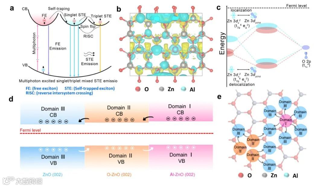 图1 (a) Al/O-ZnO单重态和三重态自旋态下自陷态激子的电子态。(b) Al/O-ZnO弛豫单重态和三重态的电子态和空穴态特征值。(c) Al/O-ZnO的成键和反键杂化模式。(d) Al/O-ZnO(掺杂Al原子浓度为0.5%)电荷转移的能带图和 (e) 原子结构。