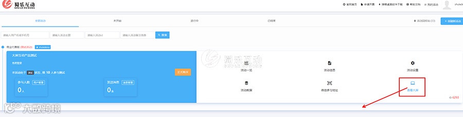 第三步,活动创建好了以后,默认微信上墙不需要做任何设置就可以直接进行测试使用的,可以点击“查看大屏”进入大屏幕页面,在大屏幕页面上通过底部的菜单栏来切换到“上墙”大屏幕页面,电脑上打开对应的页面后微信上直接扫码参与即可。