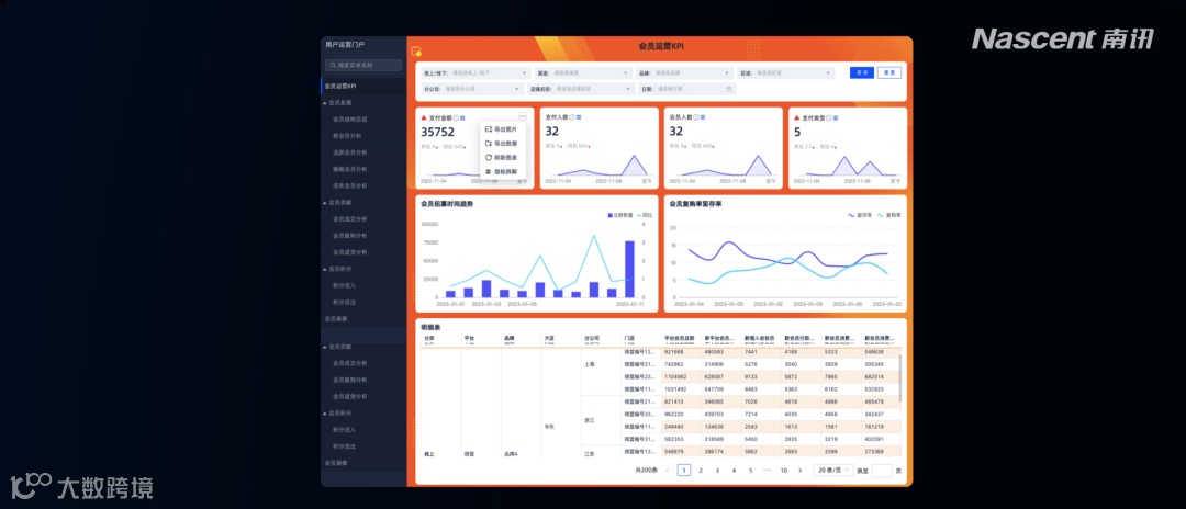 如用户运营门户中,有会员发展相关、会员贡献相关、积分相关等不同板块。每个板块有对应的分析模版和内容。大家可以看到在弹出的菜单栏中有个特殊标志,这显示的是指标阈值预警。企业可以在我们产品中设置各指标的阈值,当指标达到阈值时系统会自动触发提示,及时提醒异常状态。