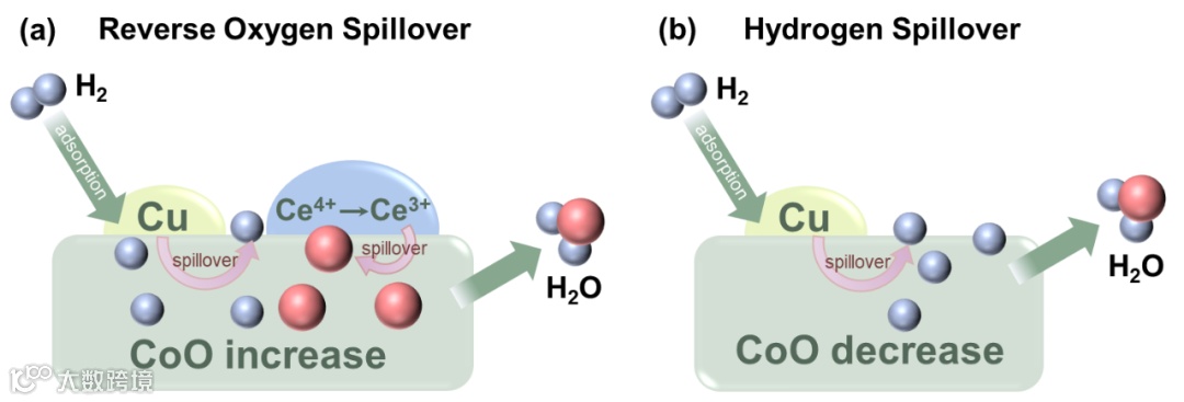 图5 (a) Cu1Co10Ce1和(b) Cu1Co10催化剂的氧逆溢流和氢溢流示意图。