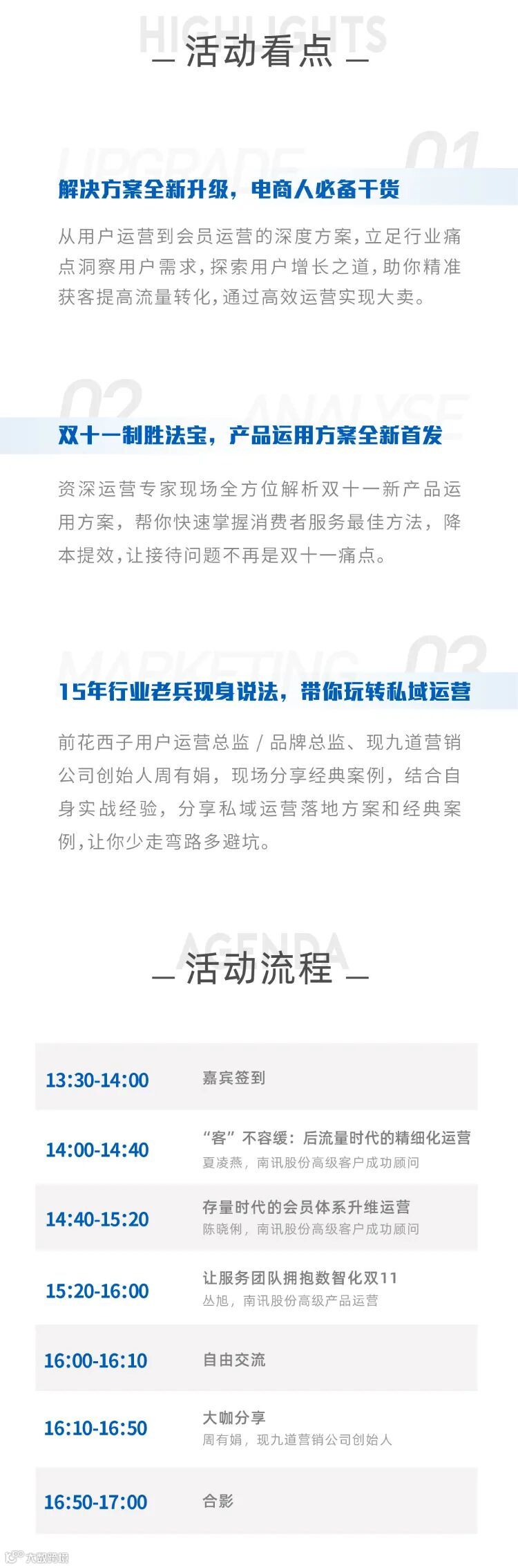 2021年9月10日,由南讯股份举办的「新格局 心运营」双11分享会将在杭州率先举行。本次分享会将基于“客道云·电商用户数字化经营系统”,面向双11商家打造从用户运营到会员运营的深度解决方案,更有资深运营专家亲临现场,全方位解析双11新产品的应用场景,快速掌握消费者运营。