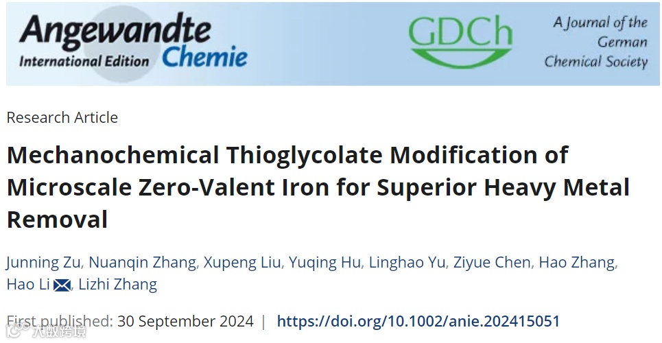 近日,上海交通大学环境科学与工程学院张礼知/李浩团队在德国应用化学《Angew. Chem. Int. Ed.》上发表了题为“Mechanochemical Thioglycolate Modification of Microscale Zero-Valent Iron for Superior Heavy Metal Removal”的研究论文。该工作采用机械力化学方法制备了双官能团巯基乙酸钠(HS-CH2COO–,TG)修饰的mZVI。TG通过其具有拉电子效应的羧基(-COO–)与mZVI惰性氧化层建立了稳固的共价键,加速了铁核电子的释放,并通过巯基(-SH)与重金属离子之间的金属(d)-硫(p)轨道杂化,显著增强了重金属在mZVI表面的吸附,从而实现了多种重金属(包括NiII、CrVI、CdII、PbII、HgII、SbIII等)的去除和固定。论文详细讨论了改性mZVI增强和重金属反应的内在机制,并强调该改性策略在拓展mZVI于环境领域应用方面的重要性。论文第一作者为华中师范大学化学学院博士生祖军宁,通讯作者为上海交通大学环境科学与工程学院副教授李浩。