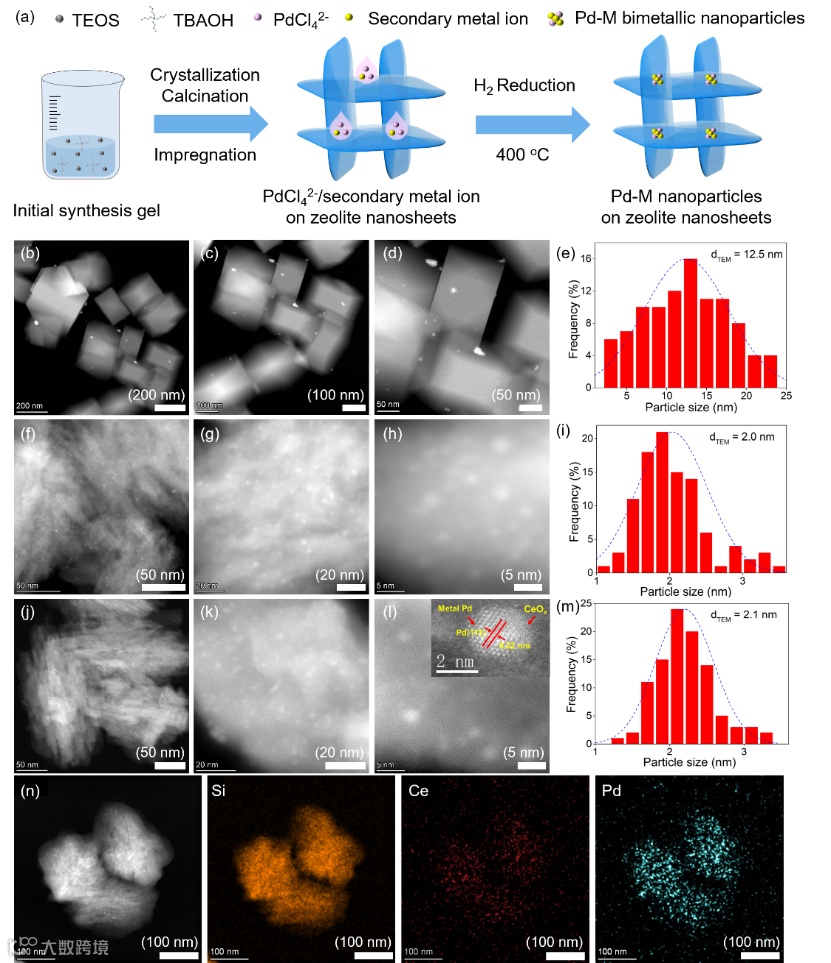 图1. 分子筛纳米片负载Pd-CeOx催化剂合成示意图及透射电镜照片。
