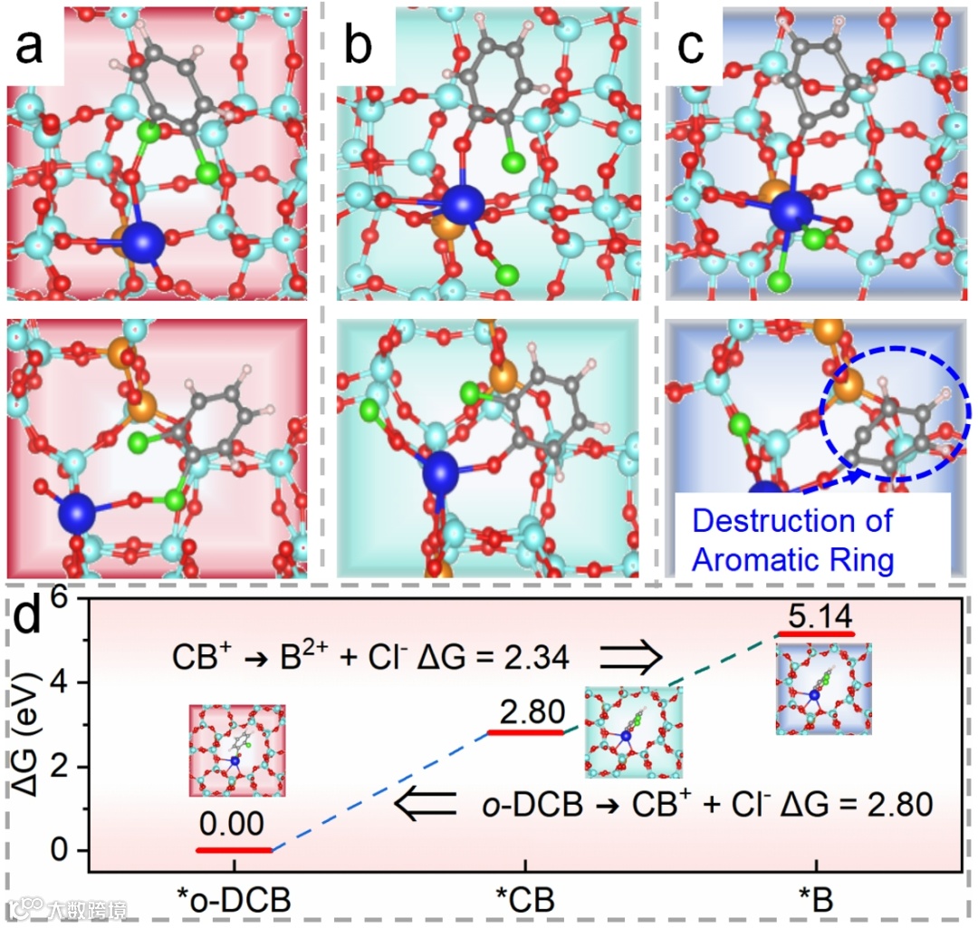 图5. 反应路径:吸附o-DCB(a)、去除一个Cl-(b)、去除两个Cl-(c)以及CeO2@ZSM-5上o-DCB去除Cl-的吉布斯自由能(d)。