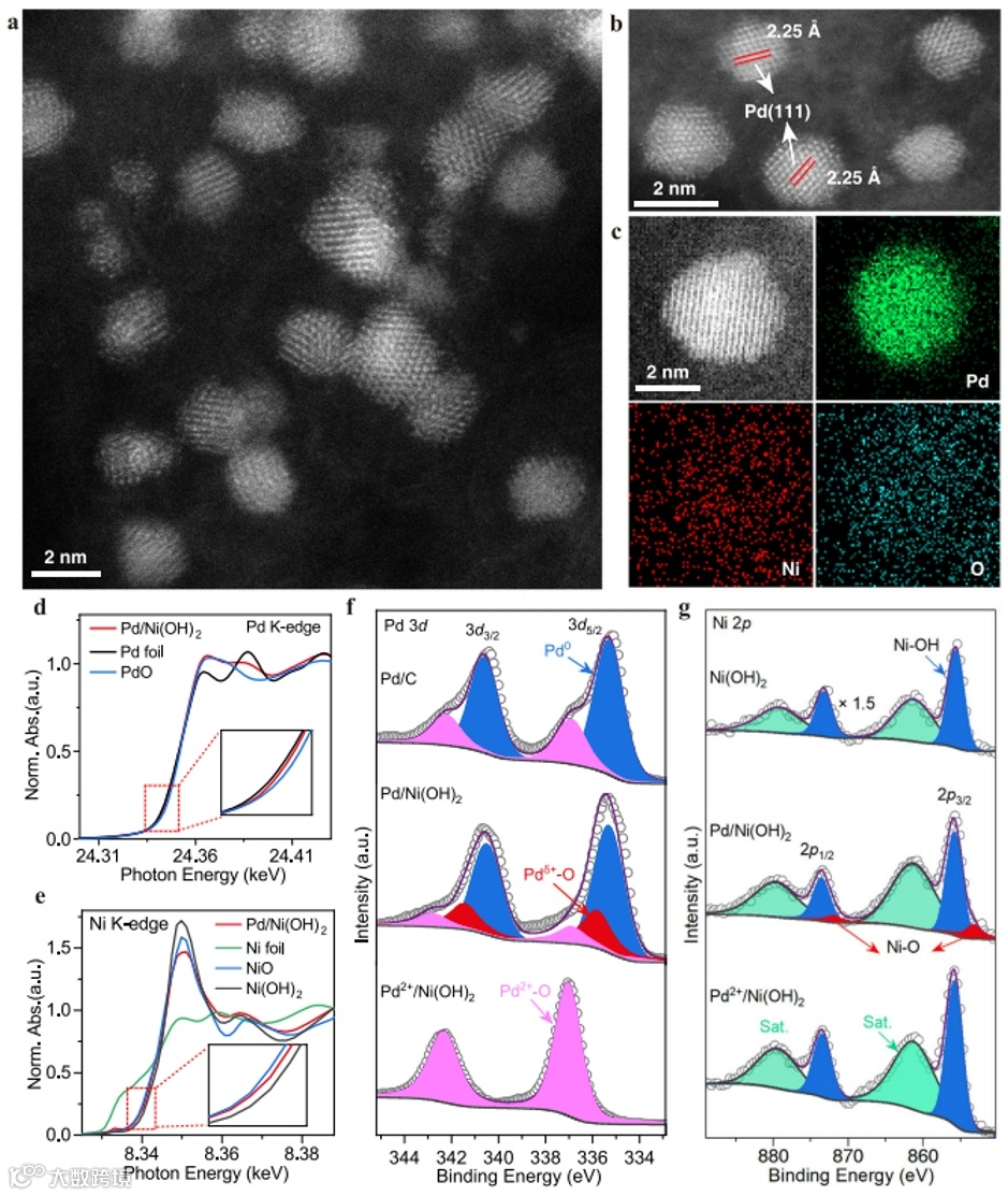 图2 | (a),(b) Pd/Ni(OH)2催化剂的STEM图像。(c) Pd/Ni(OH)2的STEM图像和相应的EDS图谱。(d),(e) Pd/Ni(OH)2催化剂的Pd K-edge和Ni K-edge XANES光谱。(f),(g), Pd/Ni(OH)2催化剂的Pd 3d和Ni 2p的XPS谱。