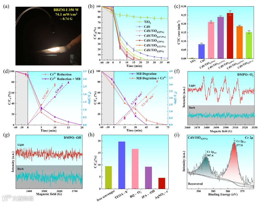 如图3a-c所示,在弱光强光源辐照下评价CdS/TiO2异质结光催化剂的Cr(VI)还原性能,研究表明在多相界面处的协同电子相互作用可有效提升其光催化活性。随后,如图3d-e所示,CdS/TiO2(20%)异质结光催化剂在还原Cr(VI)和同步降解MB过程中同样表现出良好的催化性能,通过活性物种分析证明h+和·O2-为分解有机物的主要活性物种。