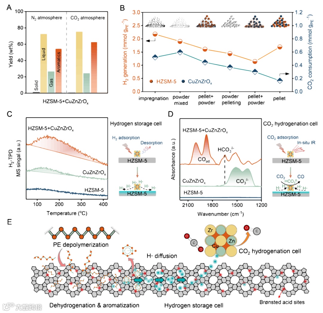通过改变酸位点-金属位点的接近度,发现在沸石上PE芳构化过程中产生的H必须扩散到具有适当的酸-金属接近的金属氧化物活性位点,在那里它与CO2结合产生CO。金属氧化物促进了沸石上氢的去除,而不是诱导芳烃前体烯烃的加氢或氢解。同时,通过H2-TPD和in-situ FTIR表征,进一步研究了PE芳构化-CO2捕氢的可能微反应机理。我们可以得出两个实质性的结论。首先,HZSM-5表现出有限的氢活化和二氧化碳吸附能力,但这种材料能够储存氢。其次,HZSM-5提供的活性氢可以将CuZnZrOx表面吸附活化的碳酸盐物质加氢,生成CO。因此,在HZSM-5 +CuZnZrOx二元催化剂体系中,HZSM-5充当“储氢池”,CuZnZrOx充当“CO2加氢池”结构。