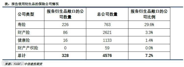 从美国保险行业的视角看,其使用衍生品的规模和比例还在快速增长,3万亿美元的衍生品名义敞口占8万亿美元的现金和投资资产规模的比例为37.5%。但进一步看,仅有7.2%的保险公司报告使用了衍生品,寿险公司、投资资产规模超过100亿美元的大型保险公司是其中的主要力量。保险行业整体以套期保值对冲风险为主要目的使用金融衍生品,其中以互换和期权为主。