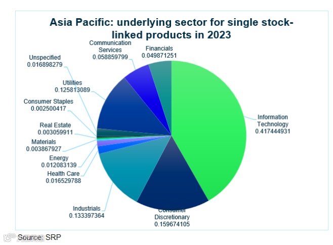 Product issuance and estimated sales volume from main Asia Pacific (Apac) markets comprising Hong Kong SAR, Taiwan region of China, Japan, South Korea, and Thailand, rose in 2023 compared with the previous year, SRP data shows. SRP数据显示,2023年,亚太地区主要市场(包括中国香港特别行政区、中国台湾地区、日本、韩国和泰国)的产品发行量和预计销售量与上一年相比有所增长。 The five major Asia markets recorded an issuance of over 93,000 non-flow structured products, which collected an estimated US$226.5 billion in sales last year, up 21% year-on-year (YoY) by estimated sales.五个主要亚洲市场共发行了超过93,000个non-flow结构化产品,去年销售额估计达到2,265亿美元,按预估销售额计算同比增长21%。 Yield enhancement products continued to lead the Apac market as the most sold product type, with estimated sales jumping by 26% YoY to US$147 billion in 2023. On the other hand, capital protection products also edged up 14% compared with the prior year selling US$76 billion.收益增强型产品继续引领亚太地区市场,成为销量最大的产品类型,预计2023年销售额同比增长26%,达到1,470亿美元。另一方面,资本保护类型的产品与去年相比也增长了14%,销售额为760亿美元。 Breaking down by underlying sectors, the IT-focused underlying sector made up 42% of the market share of single stock-linked products sales in 2023.按标的资产细分,2023年IT作为主要标的资产占单一股票挂钩类结构化产品市场销量份额的42%。 The most popular underlying stocks included Samsung Electronics, Nvidia and AMO, which were widely used in Taiwan region of China's structured notes and South Korea's equity-linked bonds (ELBs). Both products have seen astonishing sales over the past year as investors in Taiwan region of China and South Korea have been relatively receptive to US tech and IT-focused stocks.最受欢迎的标的股票包括三星电子(Samsung Electronics)、英伟达(Nvidia)和AMO,它们在中国台湾地区的结构性票据和韩国的股票挂钩债券(ELBs)中广泛使用。由于中国台湾地区和韩国的投资者对美国科技和IT类股票的接受度相对较高,这两种产品在过去一年里都取得了惊人的销量。 Consumer discretionary consisting of Chinese stock giants Alibaba and Meituan was the second most prolific sector, making up 16% of the market share in single stock-linked product sales in 2023.包括中国股票巨头阿里巴巴和美团在内的非必需消费品板块是第二大多产板块,在2023年单一股票挂钩产品销量中占据了16%的市场份额。 The utilities sector including stocks like Korea Electric Power Corporation amounted to 13% market share.包括韩国电力公司(Korea Electric Power Corporation)等股票在内的公用事业板块占据了13%的市场份额。 The communication services sector was led by Tencent, KT and Netflix which captured six percent of the market share, while financial sectors with representative stocks like Hong Kong Exchanges and Clearing and Ping An Insurance took up five percent.通信服务板块以腾讯、KT和Netflix为首,占据了6%的市场份额,而以香港交易及结算所有限公司和平安保险为代表的金融板块则占据了5%的市场份额。 Products tracking basket of equity shares were mostly comprised by mixed sectors, followed by IT and financials.跟踪一篮子股票的产品主要由综合行业构成,其次是IT和金融行业。 China also saw a similar trend in 2023, with IT, the financial industry and mixed underlying sectors seeing the most sales among equity-linked structured deposits. Each sector took 29%, 18% and 18% market share, respectively, per estimated sales volume.中国在2023年也出现了类似的趋势,IT、金融行业和混合标的板块在股票挂钩结构性存款中销售最多。根据预估的销售量,每个板块分别占有29%、18%和18%的市场份额。 Among these equity-linked structured deposits, the autocall was the most common payoff structure, making up around 72% of the market share per estimated sales in 2023, followed by digital (20%), shark fin (five percent) and twin win (three percent).在这些股票挂钩结构性存款中,Autocall是最常见的产品收益类型,约占2023年预计销售额市场份额的72%,其次是Digital(20%)、Shark Fin(5%)和Twin Win(3%)。 文章来源:SRP网站5月3日报告https://www.structuredretailproducts.com/news 【免责声明】本文信息仅用于投资者教育之目的,不构成对投资者的任何投资建议,投资者不应当以该等信息取代其独立判断或仅根据该等信息作出决策。本文信息力求准确可靠,但对这些信息的准确性或完整性不作保证,亦不对因使用该等信息而引发或可能引发的损失承担任何责任。