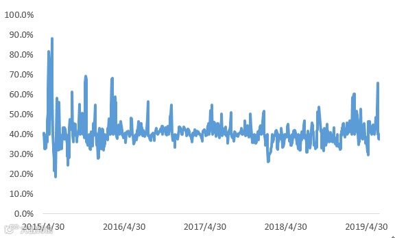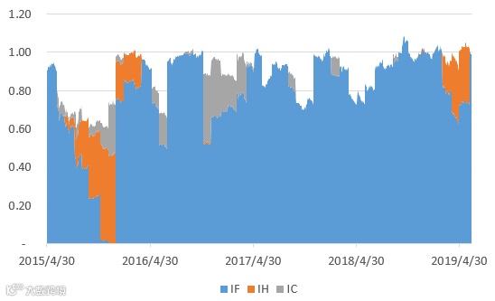 从滚动三个月的贝塔值来看,该组合贝塔值的波动较大,其中IF与IH的Beta值更接近1,IC的Beta值则相对较低,考虑IC的高波动性,可以推断该组合与IC的相关性较低,更适合采用IF或者IH进行套保,若采用IC进行套保,预期套保效果较差。若仅考虑采用单一期货品种进行对冲,选用IF或者IH合约进行对冲较为合适。值得注意的是,在本组合中,无论IF、IH还是IC,均发生过贝塔值突破1的情形,特别在2018年10月初至2019年1月末,该组合相对于IF、IH的贝塔值快速冲高,峰值一度达到1.41与1.51,这意味着如果需要完全贝塔中性对冲的话,将面临着期货空头合约价值大于现货头寸的情况,若缩小对冲比例,则套保效率势必会受到影响,这将会给套保工作带来挑战。