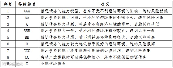 估值分类评价标识包括AAA、AA、A、BBB、BB、B、CCC、CC和C级共九档,各档次可用“+”、“-”符号进行微调,表示略高或略低于本等级;微调不改变所在档次。各等级含义如下表: