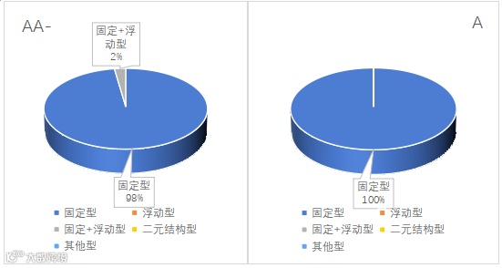 从认购金额来看,本周发行的AAA估值等级收益凭证中,23.55%为固定型收益凭证,36.58%为浮动型收益凭证,33.73%为固定+浮动型收益凭证,0.01%为其他型收益凭证,6.12%为二元结构型收益凭证;AA+估值等级收益凭证中,18.19%为浮动型收益凭证,41.86%为固定+浮动型收益凭证,32.26%为固定型收益凭证,7.68%为二元结构型收益凭证,未发行其他型收益凭证;AA估值等级收益凭证中,80.09%为固定型收益凭证,18.55%为固定+浮动型收益凭证,1.36%为二元结构型收益凭证,未发行浮动型收益凭证和其他型收益凭证;AA-估值等级收益凭证中,95.69%为固定型收益凭证,4.31%为固定+浮动型收益凭证,未发行浮动型收益凭证、二元结构性收益凭证和其他型收益凭证;A估值等级收益凭证中,全部为固定收益型收益凭证。