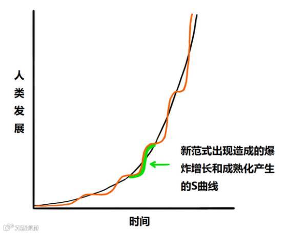 如上图所示,人工智能在达到“奇点”之前,发展速度是十分平稳的,如同图一红色、橙色两条预估轨迹,按照过去的发展速度,人工智能一度发展缓慢,没有取得较大的突破;橙色曲线的预估站在了当前科技发展的速度,发展速度有明显的变化,而绿色被认为是正确的发展轨迹,是因为人工智能在达到“奇点”后的发展速度不可估量,两次工业革命前后社会产生的变化就说明了这个道理。正如图二,新范式出现往往发展速度近乎垂直,达到一定高度会缓慢下来,直到另一个新的范式出现。