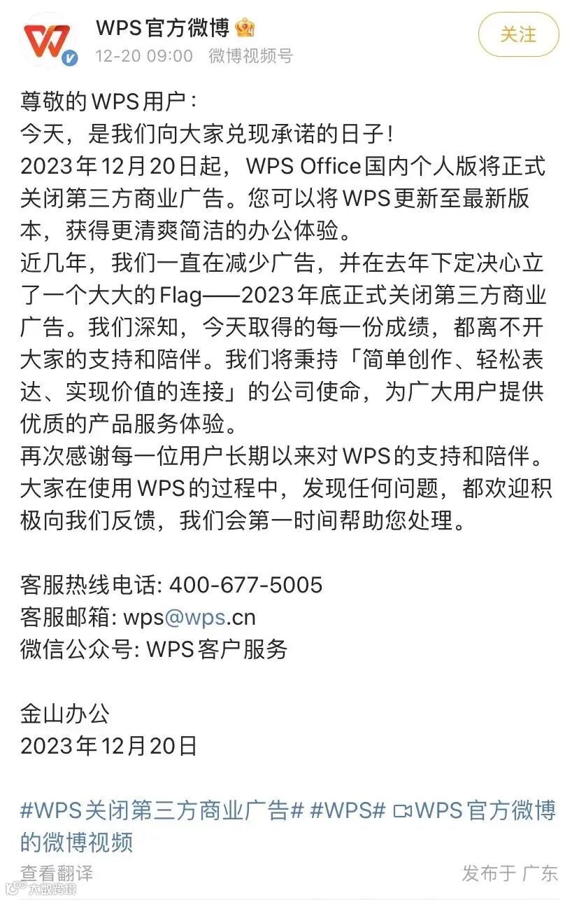 金山办公宣布,2023年12月20日起,WPS Office国内个人版将正式关闭第三方商业广告。