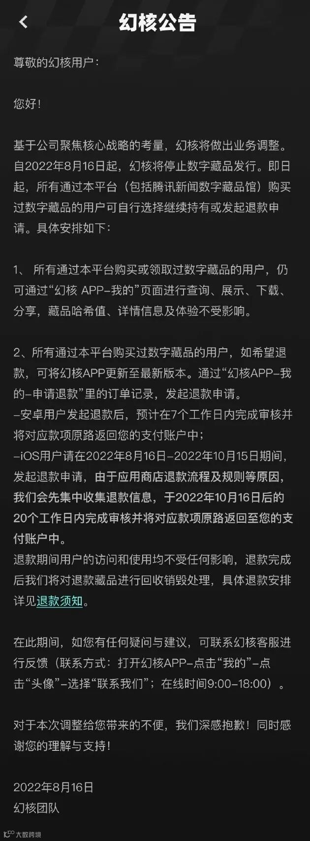 8月16日上午,腾讯旗下的数字藏品平台“幻核”发布公告称,自当日起,幻核将停止数字藏品发行,所有通过其平台购买数字藏品的用户,皆可自行选择继续持有或发起退款申请。