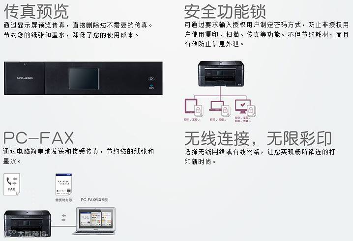 用户可以通过选择无线网络,让您实现畅所欲连的打印新时尚,同时可以通过无线网络多台设备共享一台一体机,实现