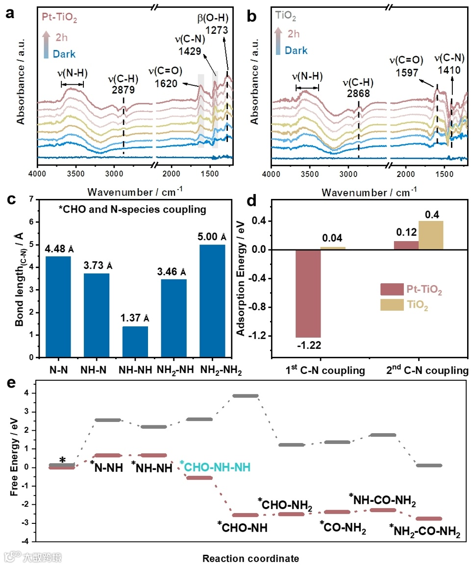 最后,结合原位红外和理论计算解析了光催化氧化还原反应的C-N偶联合成尿素的反应机理。光催化尿素的合成是通过协同CH3OH氧化和N2还原过程产生的活性N中间产物(*NH-NH)和C中间产物(*CHO)耦合进行的。然后,通过理论计算证实了*NH-NH和*CHO的C-N偶联过程,以支持实验结果。