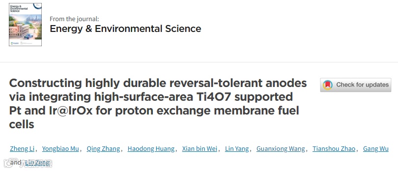 这项工作关注了质子交换膜燃料电池中反极现象,提出开发了一种容易合成Ti4O7的方法并应用于质子交换膜燃料电池阳极,配合新型开发的Ir@IrOx结构析氧催化剂,在降低成本的同时大幅度提高阳极催化层抗反极能力,在简化Ti4O7合成过程后,使其有极大潜力应用于商业化质子交换膜燃料电池阳极设计中。