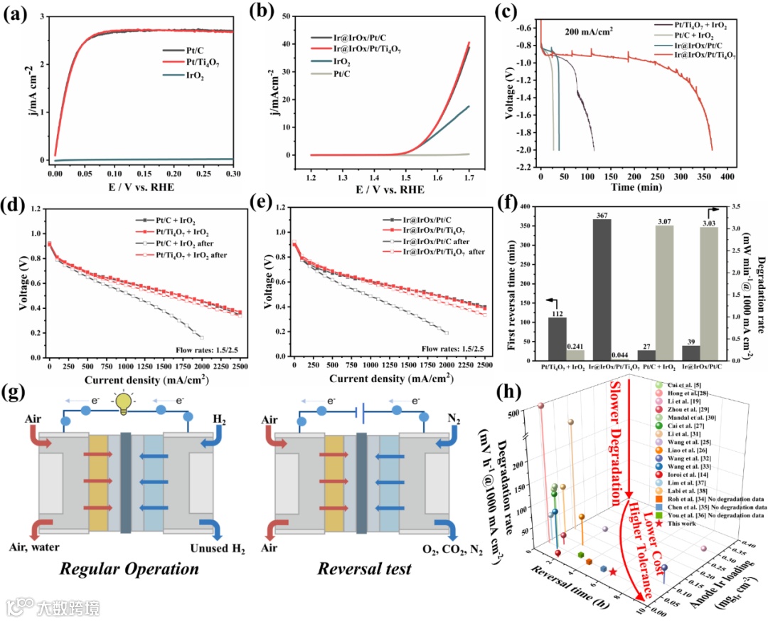 进一步地,对合成的催化剂进行包括半电池、极化曲线、抗反极测试等一系列电化学测试。结果表明,采用Ir@IrOx/Pt/Ti4O7催化剂的膜电极拥有远高于其他对比样的抗反极时间(约6小时),为同样碳载体对比样的10倍,且反极后极化性能衰减速率相较对比样低两个数量级。在多维综合考虑Ir用量(反映成本)、抗反极时间(反映抗反极能力)以及性能衰减速率(反映实际应用潜力)指标下,本研究开发的Ir@IrOx/Pt/Ti4O7在与同类型研究比较中仍有较大的优势。