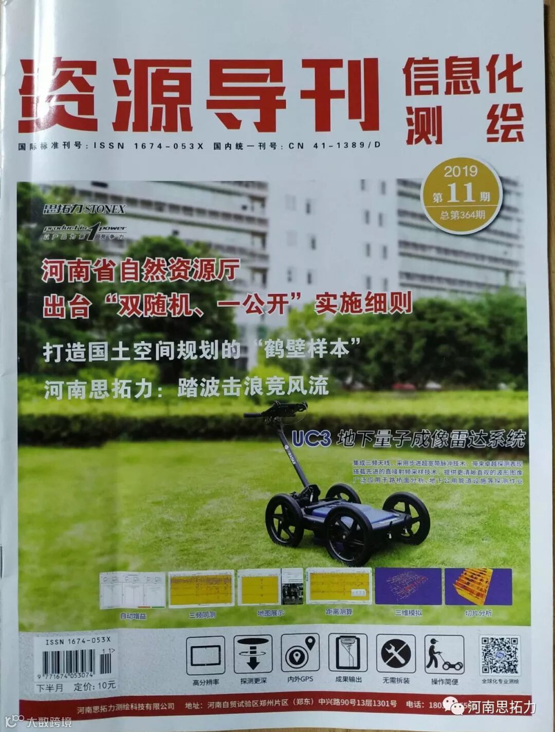 《资源导刊·信息化测绘》2019年第11期的《经天纬地》栏目发表了对我公司的专题报导。《资源导刊·信息化测绘》是经国家新闻出版管理部门批准,由河南省自然资源厅主管、河南省测绘地理信息局承办的国家内外公开发行的科技类综合期刊。《资源导刊·信息化测绘》是属于测绘地理信息人的杂志,全面展示河南省以及全国的测绘地理信息方向、动态、经验、文化与最新的学术成果。