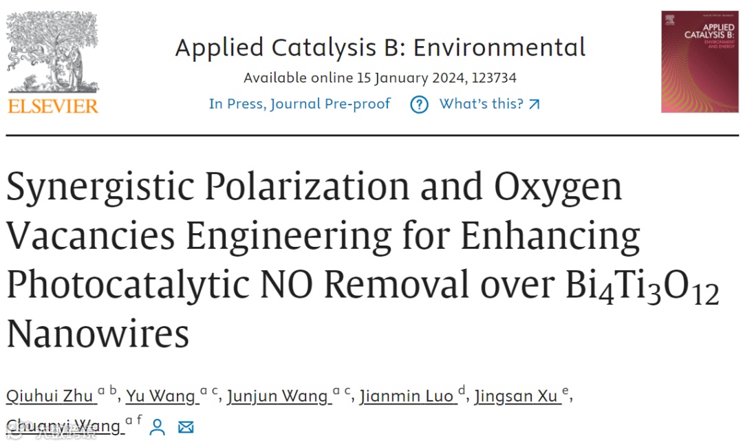 Qiuhui Zhu, Yu Wang, Junjun Wang, Jianmin Luo, Jingsan Xu, Chuanyi Wang*, Synergistic Polarization and Oxygen Vacancies Engineering for Enhancing Photocatalytic NO Removal over Bi4Ti3O12 Nanowires,Applied Catalysis B: Environmental (2024) 123734.