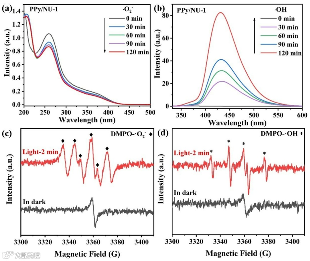 此外,采用NBT法和TA法对PPy/NU-1催化剂表面•O2-和•OH的生成进行了监测 (Fig.6(a, b))。NBT-•O2-加合物的峰值随光照时间的延长而逐渐降低,而TA-•OH加合物的峰值随光照时间的延长而逐渐升高,进一步证实了•O2-和•OH活性物质的存在。此外,还通过ESR测试可以检测到DMPO-•O2-和DMPO-•OH的峰(Fig.6(c, d)),这表明PPy/NU-1在光照下可以生成•O2-和•OH。