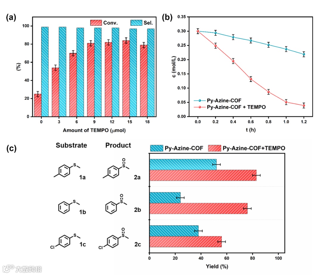 亚砜是一类具有高价值的反应中间体,被广泛用于药物活性成分和反应助剂的合成。光催化选择性氧化硫化物是一种可通过控制活性氧的生成来获得亚砜的有效途径。由于O2•−的亲核攻击可以保证亚砜的高选择性,而Py-Azine-COF的LUMO电位恰好可以使O2活化为O2•−。因此Py-Azine-COF可用于O2的活化和后续的光催化氧化反应。研究发现,TEMPO作为一种稳定的氧化还原介质,可以与高结晶度的Py-Azine-COF建立明显的协同作用,并显著提高其活性(图4)。同时2 mol% TEMPO对三种硫化物的选择性光催化氧化均有不同程度的促进作用。