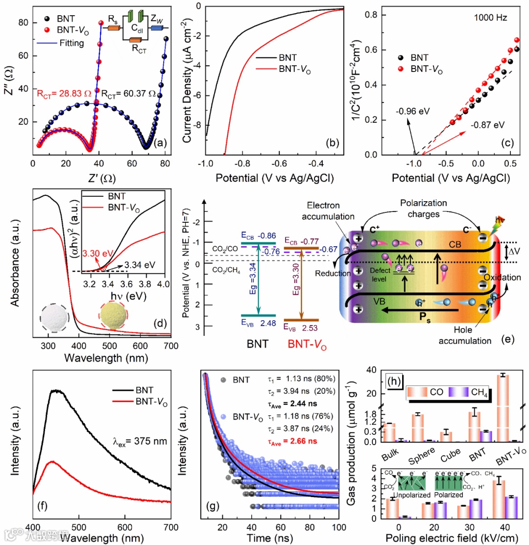 钛酸铋钠(BNT)基材料因高自发极化(归因于具有孤对电子的高极化态铋离子)成为著名的铁电体,而在非化学计量态或缺氧态表现出多样的导电机制:从绝缘、混合导电、到纯离子导电行为。协同高极化,其在催化过程中潜在的低氧空位跃迁势垒有利于电荷迁移或原位表面应力调节及局域化学环境控制,有望在催化CO2RR方面表现出潜力。本工作利用原位还原手段得到了氧空位(OV)修饰的BNT铁电体,在不引入任何异质元素的情况下,系统地研究了具有不同微观结构和氧空位修饰的BNT材料,以增强其气固CO2光还原能力。进一步阐述了阳离子和OV的化学状态和配位环境,揭示了弱化的Bi-O键和增强的晶格畸变。通过材料固有自发极化产生的内置电场、特殊形貌及缺陷能级等协同作用,优化了载流子动力学和反应位点,扩大了可见光吸收范围。进而重要地提高了缺陷催化剂的CO2还原效率,在铁电体催化剂方面具有极大的竞争力。此外,材料预极化处理可有效提升电子和空穴的分离驱动力,有利于多电子转移并实现产物选择性。本研究为设计高效铁电光催化剂提供了一种系统的方法,同时为二氧化碳催化转化的铁电光催化剂家族增加了新成员。