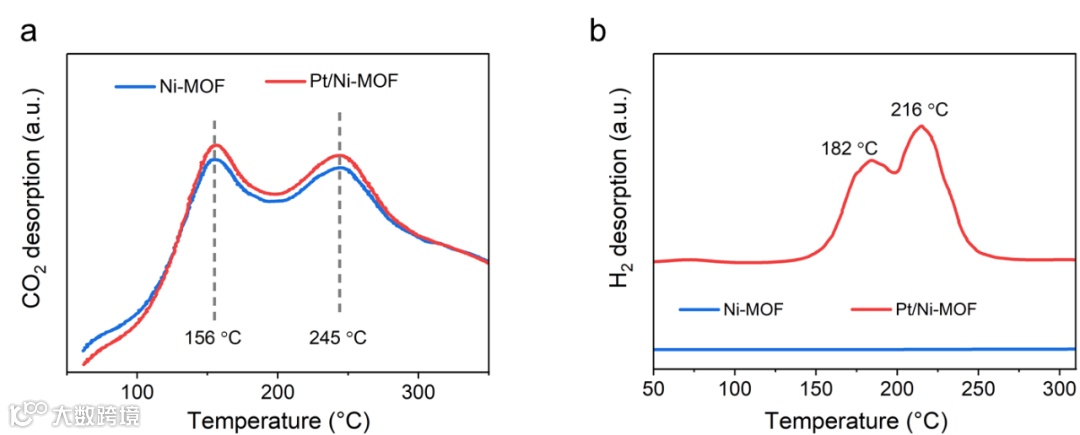 图4. 光催化还原CO2吸附位点探究:CO2-TPD和H2-TPD结果表明CO2分子主要吸附在不饱和金属Ni位点,而H2吸附在Pt纳米颗粒上,与上述CO2气体吸附结果相吻合。