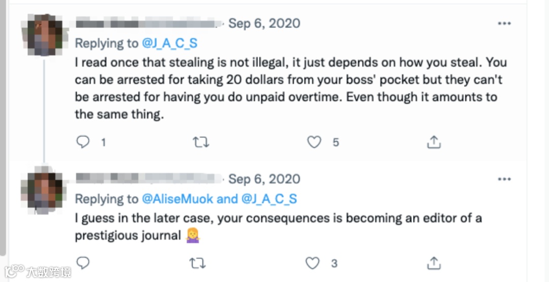 「偷窃有些时候并不违法,比如说你从你老板的口袋了拿了20块钱,后果是你会被逮捕,但是你老板让你无偿加班,后果却是他会成为知名期刊的主编。」