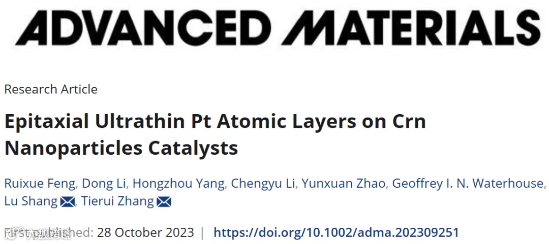 Ruixue Feng, Dong Li, Hongzhou Yang, Chengyu Li, Yunxuan Zhao, Geoffrey I. N. Waterhouse, Lu Shang, Tierui Zhang, Epitaxial Ultrathin Pt Atomic Layers on CrN Nanoparticle Catalysts, Adv. Mater. 2023, DOI: 10.1002/adma.202309251.