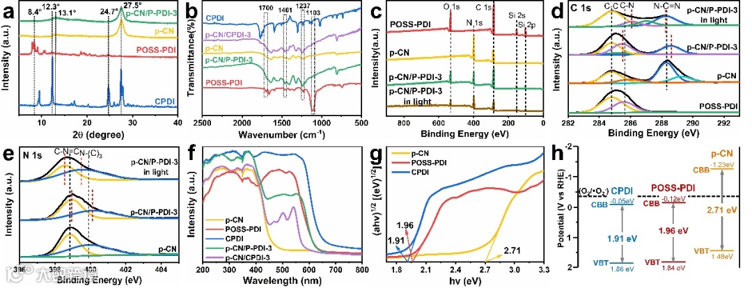 图2. (a) CPDI、POSS-PDI、p-CN、p-CN/CPDI-3和p-CN/P-PDI-3的XRD图谱和(b) FT-IR光谱。POSS-PDI, p-CN和p-CN/P-PDI-3的XPS光谱:(c) XPS总谱,(d)C 1s,(e)N 1s。(f)不同样品的紫外-可见光吸收图和(g)带隙。(h)带隙结构图。