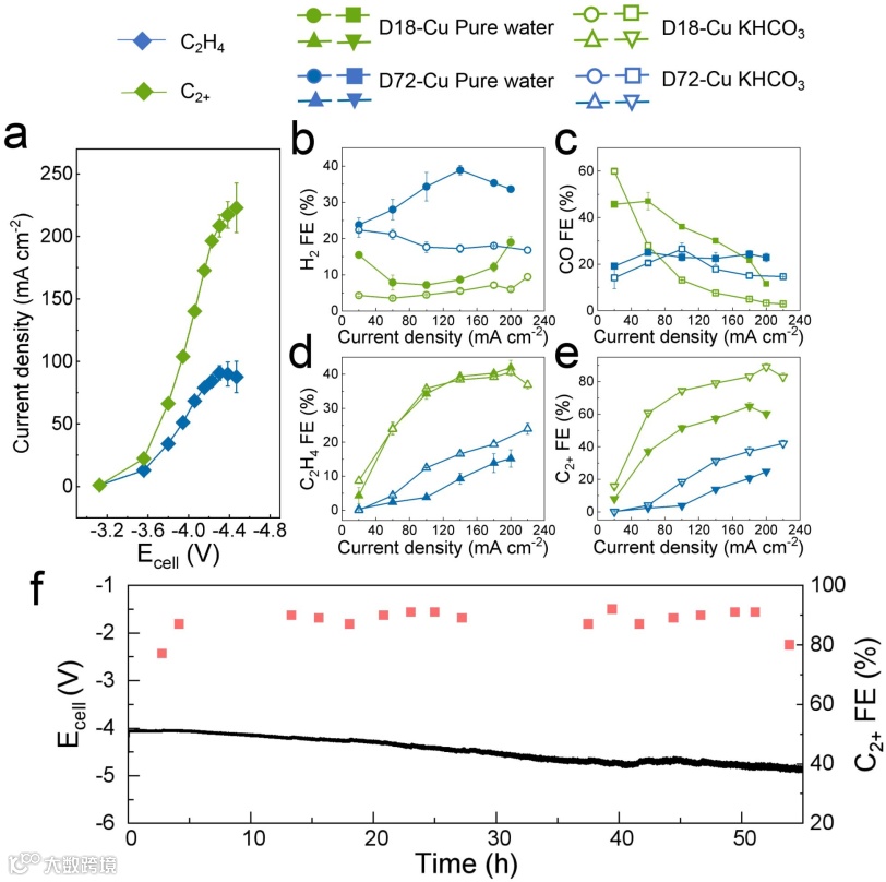 二氧化碳电解提供了一种碳中和方法,用于替代生产源自化石燃料的碳燃料和化学品。CO2 电解阴极反应,即 CO2RR,对于推广该技术至关重要。Cu 催化的 CO2RR 已显示出将 CO2 升级为高附加值多碳化合物的潜力,例如乙烯(C2H4)、乙醇(EtOH)、乙酸盐(AcO-)和正丙醇(n-PrOH)。要想把CO2RR从实验室科学发展为实用的碳利用技术,如何以高电流密度和高效率实现这些化学品的电合成至关重要。
