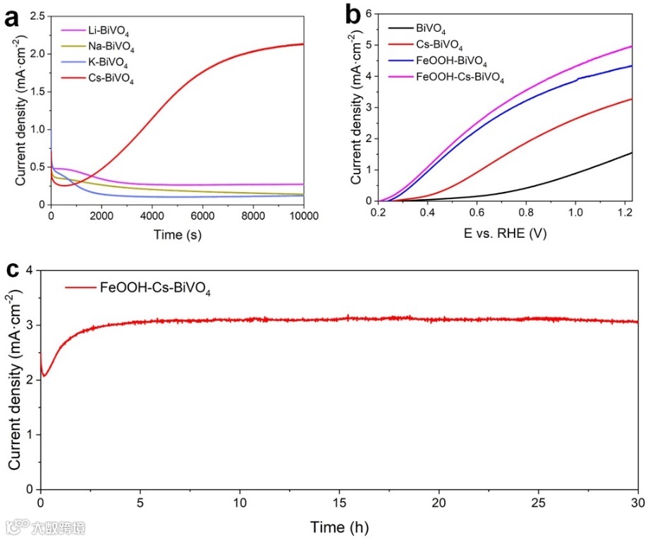 由于Cs+的独特化学性质,电解质溶液中的Cs+参与了BiVO4的光腐蚀过程,在电极表面形成CsBiVO无定型层,形成的CsBiVO层抑制BiVO4光腐蚀的进一步发生,并提升电荷转移效率和水氧化性能,从而大幅提升了光电化学水氧化性能。