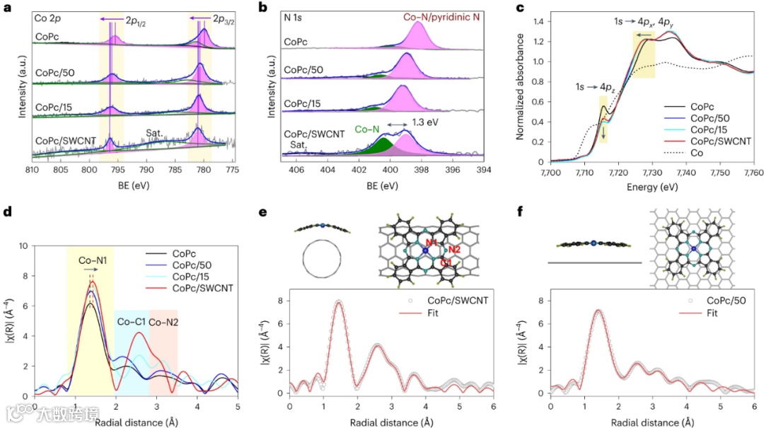 得益于电子结构以及活性位点周围的可调控配体环境,分子配位化合物如金属卟啉和金属酞菁等可作为高效的CO2还原反应(CO2RR)催化剂。然而,与其它大多数分子催化剂一样,上述分子配合物催化剂主要将CO2还原为CO;可选择性还原CO2生成CO以外产物的分子催化剂几乎没有报道。1984年对酞菁钴(CoPc)的早期研究表明,其甲醇法拉第效率(FE)<5%。该研究直到近年来才受到较大关注,即Wang和Robert等团队分别报道了沉积于多壁碳纳米管(MWCNTs)上的CoPc表现出增强的FEMeOH。其中,Wang等研究发现高度分散于MWCNTs上的CoPc具有高达44%的FEMeOH。Robert等开发出一种制备CoPc–MWCNT复合材料的不同策略,该催化剂在CO2RR过程中仅产生少量甲醇,但可利用CO还原反应(CORR)产生大量甲醇。迄今为止,大多数CoPc基催化剂仅生成CO作为主要产物而不会产生大量甲醇。因此,实现CoPc催化CO2RR过程以生成CO之外的产物并理解其机制仍然存着诸多挑战。