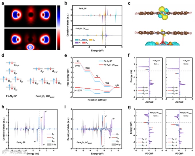 图 1.理论计算。a) Fe-N4 SP (上) 和Fe-N4O1 OCquasi (下) 的电子局域化函数。b) Fe-N4 SP 和Fe-N4O1 OCquasi 的PDOS 图。c) Fe-N4 SP (上) 和Fe-N4O1 OCquasi (下) 的自旋密度分布。d) d轨道分裂调控示意图。e) Fe-N4 SP 和Fe-N4O1 OCquasi 在不同电极电势下的ORR自由能图。f) Fe-N4 SP 和 g) Fe-N4O1 OCquasi 在*OH吸附后,Fe-O键的COHP分析。在 h) Fe-N4 SP 和 i) Fe-N4O1 OCquasi 中,Fe-d轨道和O-p轨道的PDOS 图。σ*表示Fe dz2轨道与O p轨道之间的反键。π*表示Fe dxz/ dyz轨道与O p轨道之间的反键。