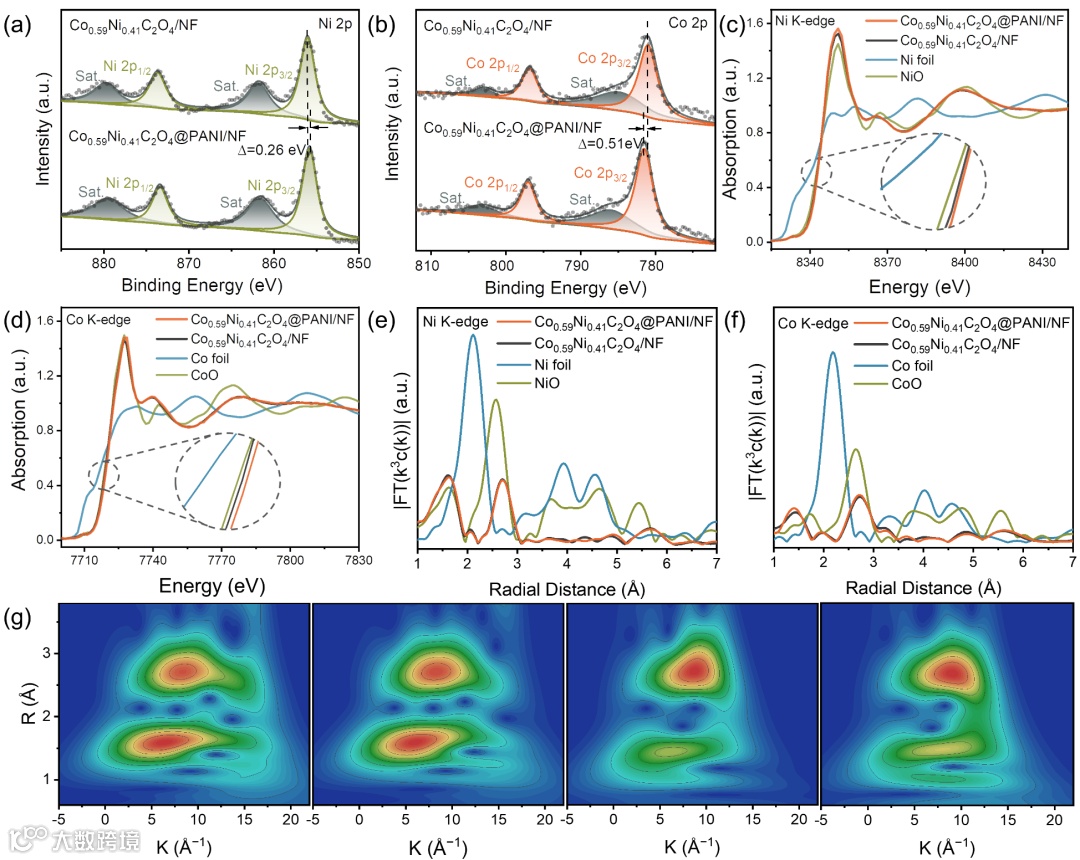 具有离域π电子的PANI和具有局部d轨道电子的金属点之间可以构建π-d电子耦合。X射线吸收光谱(XAFS)与X射线光电子能谱(XPS)共同证明π-d电子耦合的存在。与Co0.59Ni0.41C2O4/NF相比,Co0.59Ni0.41C2O4@PANI/NF的Ni 2p的光电子峰向高结合能转移了0.26 eV。在Co2+对应的Co 2p区域也观察到了类似的结合能的增加(0.51 eV)。在Ni和Co的K边都移到了更高的能量位置,从而表现出离域的电子密度(图2c和d)。