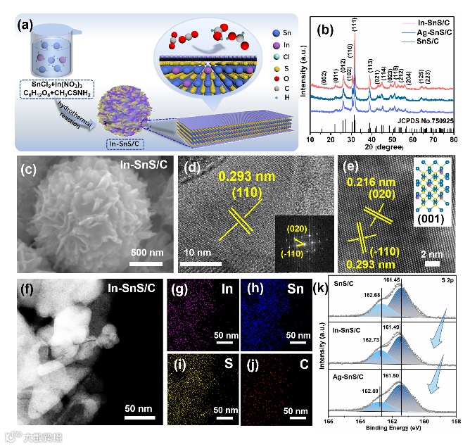 本工作通过水热和热焙烧的方法合成了In(Ag)掺杂的SnS纳米材料。XRD、HRTEM和HAADF-STEM揭示了其晶体结构和形貌。XRD物相表征结果证明In(Ag)掺杂后SnS的物相稳定不变。HAADF-STEM与EDS测试结果证明In(Ag)异原子取代Sn原子实现掺杂。XPS表明掺杂对表面S原子价态产生轻微的变化,说明异质原子In与Ag对S-金属键能起到了调节作用。
