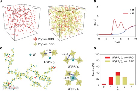 图 4. 基于 MD 模拟的结构分析。(A) 在 DEC 系统中,1 M(左)和 4 M(右)LiPF6 的结构图。红色, PF6- 不含有 SRO。金色,PF6- 含有 SRO。为清楚起见,隐藏了 Li+ 和 DEC。(B) P-F RDF。4 M 溶液的第一个峰对应于 SRO。(C) 在 4 M LiPF6:DEC系统中,包含 107 Li+、115 PF6-以及三个代表性局部结构单元 Li+(PF6−)2、 Li+(PF6−)3、和 Li+(PF6−)4 的聚集体视图。 (D) 在 4 M LiPF6:DEC 系统中,含 SRO/总 Li+(PF6−)n 单元的分数图。