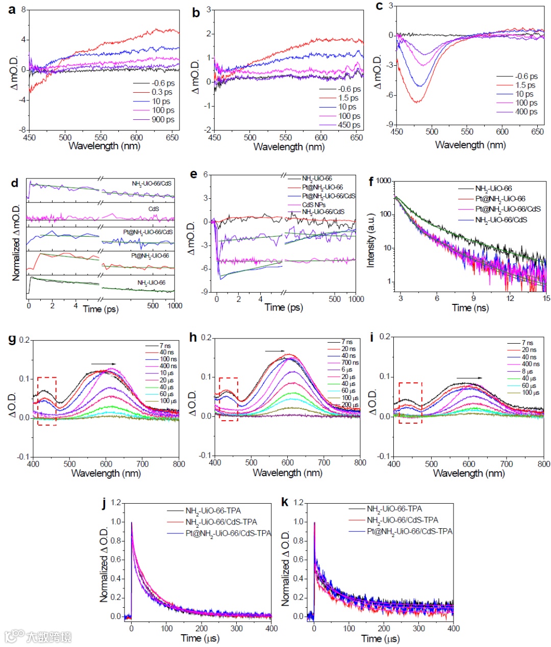 为了了解HER光催化活性中的空穴动力学,我们使用三苯胺(TPA)作为空穴指示剂,它被光生空穴氧化形成一个阳离子自由基(TPA•+)。图 3g 显示了在 TPA 存在下 355 nm 激光激发时NH2-UiO-66的微秒TAS,在600 nm处观察到的衰减信号是由于TPA•+自由基的形成,其长寿命为67.3 μs。在430 nm处的峰归因于光生空穴陷阱态,该空穴陷阱态具有较强的氧化能力。这也发生在NH2-UiO-66/CdS和Pt@NH2-UiO-66/CdS(图3h,i)中。Pt@NH2-UiO-66/CdS中 TPA•+的寿命为74.6 μs,比NH2-UiO-66和 NH2-UiO-66/CdS的寿命均要长。此外,陷阱态的在 430 nm的动力学图谱如图 3k 所示,通过介导空穴陷阱快速空穴转移的时间常数为1.16 μs。结果表明,从NH2-UiO-66中的陷阱态有效的空穴转移强烈支持高HER光催化活性。