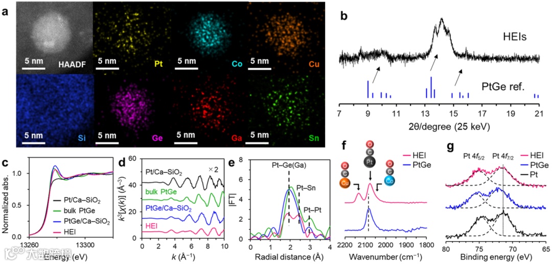 图2. HEI (0.25) 催化剂的表征。(a) 单个纳米粒子的HAADF-STEM 图像和相应的元素mapping图。(b) 同步加速器 XRD图谱。Pt/Ca–SiO2,块状PtGe, PtGe/Ca-SiO2, 和 HEI (0.25) 的 Pt LII-edge (c) XANES,(d) k3 加权 EXAFS和 (e) 傅里叶变换 EXAFS。(f) 在-100 °C 下,吸附在 PtGe/Ca-SiO2和 HEI(0.25) 上的 CO 的 FT-IR 光谱。(g) Pt/Ca-SiO2、PtGe/Ca-SiO2 和 HEI (0.25) 的 XPS 光谱。