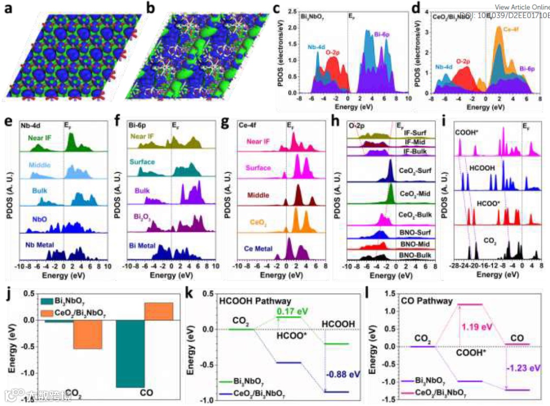 图 5. DFT 计算。(a) Bi3NbO7 和 (b) CeO2/Bi3NbO7 费米能级附近电子分布的 3D 等值线图。紫色球 = Bi,青色球 = Nb,黄色球 = Ce,红色球 = O。蓝色等值面 = 键合轨道,绿色等值面 = 反键合轨道。(c) Bi3NbO7 和 (d) CeO2/Bi3NbO7的 PDOS 比较。(e) Nb-4d、(f) Ce-4f、(g) Bi-6p 和 (h) O-2p 的与位点相关的 PDOS。(i) 在 CeO2/Bi3NbO7上,生成 HCOOH 的 CO2RR 中的关键吸附物PDOS 比较。(j) CO2 和 CO 在 Bi3NbO7 和 CeO2/Bi3NbO7 上的吸附能。在Bi3NbO7 和 CeO2/Bi3NbO7上的 (k) HCOOH 和 (l) CO 反应生成途径。
