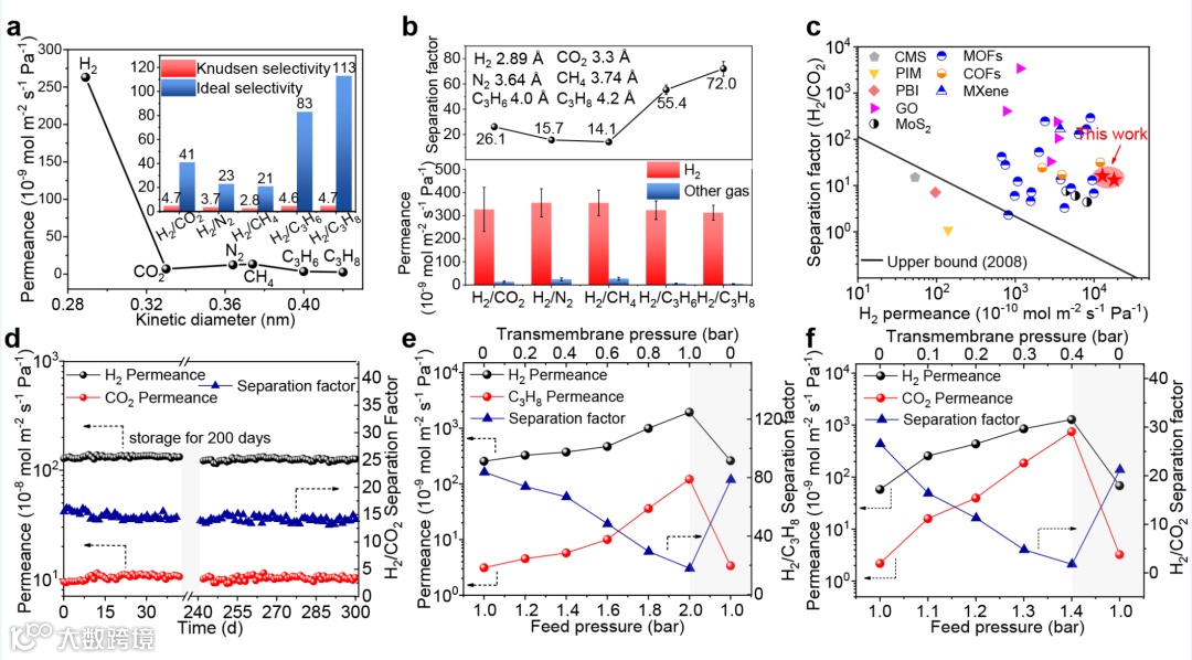 图3. g-C3N4膜的气体分离性能: 实验结果表明,由自下而上的g-C3N4纳米片组装的g-C3N4膜具有显著的分离性能,其中H2对CO2、N2、CH4、C3H6和C3H8的选择性分别为41、23、21、83和113,远远超过了努森选择性。此外,即使在温度波动、潮湿环境、超过200天的长期运行和高压条件下,g-C3N4膜也显示出良好的稳定性。