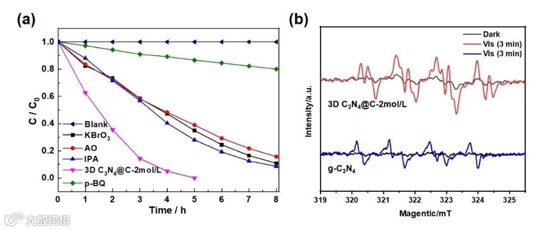 图7 (a)3D C3N4@C-2mol/L在可见光照射下添加和不添加AO、p-BQ、IPA或KBrO3降解苯酚的光催化性能比较;(b)在3D C3N4@C-2mol/L和g-C3N4的DMSO溶液中通过DMPO自旋捕获的ESR光谱