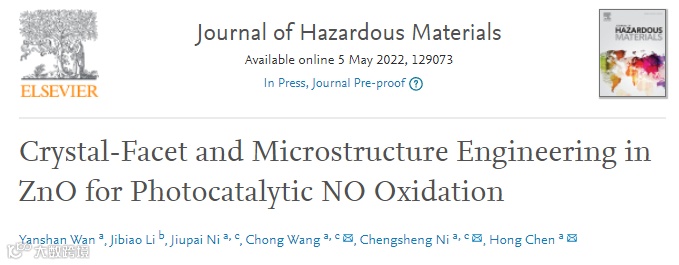 参考文献:Yanshan Wan, Jibiao Li, Jiupai Ni, Chong Wang, Chengsheng Ni, Hong Chen, Crystal-Facet and Microstructure Engineering in ZnO for Photocatalytic NO Oxidation, Journal of Hazardous Materials, 2022, https://doi.org/10.1016/j.jhazmat.2022.129073.